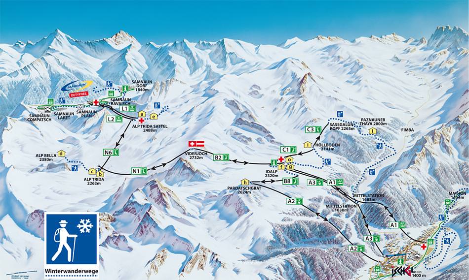 Einige der Pisten (Pistenplan vergrössert ansehen) starten dabei genau auf der unsichtbaren schweizerisch-österreichischen Grenze. So werden Sie, vielleicht ohne es zu merken, international, denn es kann durchaus sein, dass ihr linker Fuss schon in Österreich steht, während der rechte Fuss noch in der Schweiz verweilt.